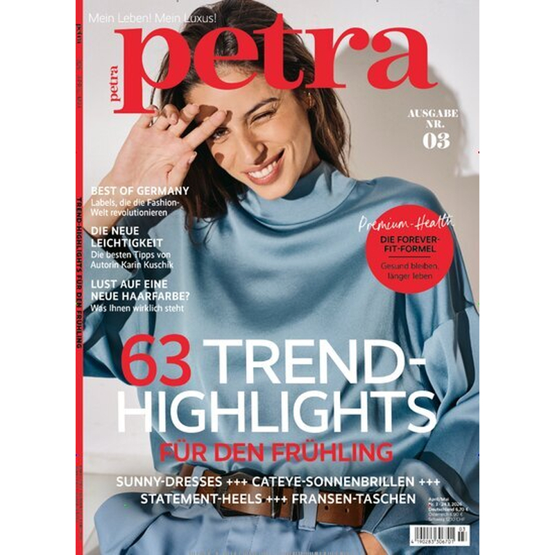 Die Zeitschrift petra ist eine deutsche Illustrierte, die sich an vielseitig interessierte Frauen wendet. Das Fashion- und Lifestyle-Magazin zeigt Ihnen mit Themen wie Beauty, Styling und Mode die schönsten Seiten des Lebens. Darüber hinaus gibt es Tipps für mehr Erfolg in der Arbeitswelt. Mit petra erhalten Sie als Frau von heute interessante Anregungen, die Ihnen dabei helfen, Ihren Alltag aufregend zu gestalten. Das Frauenmagazin petra stellt Ihnen spannende kulturelle Events vor und lässt Sie beim Lesen lebendiger Reiseberichte von der Ferne träumen. Dabei verwöhnen faszinierende Bilder Ihre Augen. Die monatlich erscheinende Frauenzeitschrift petra bietet Ihnen eine aufregende Exkursion durch internationale Szene-Ereignisse. Mit petra sind Sie bereits über Trends informiert, bevor diese von der breiten Masse übernommen werden. Bringen Sie mit petra Spontanität und Intuition in Ihr Leben. Lernen Sie jetzt die inspirierende Zeitschrift mit einem petra Abo kennen.